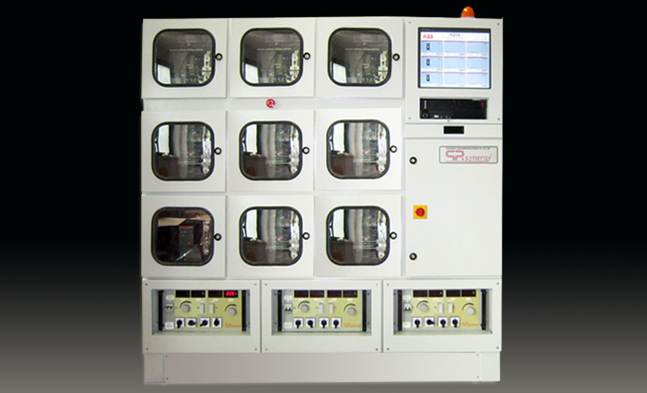 Life test machine for power circuit-breakers This machine performs testing of ABB circuit-breakers of the Tmax series models: T4, T5 and new XT1, XT2, XT3, XT4. The machine has nine stations which can be tested individually by setting the switches on the operator panel model and the type of testing to be carried out with lever control cylinder or motor. This test verifies the mechanical life time until its end of life. It is possible to set the on operator panel the opening coil (SOR) and the under voltage release coil (UVR). The working voltage of the coils of openness, minimum and engines are manually selectable supply. There are three DC and AC Multivoltage power supply up to 800 Amps.